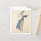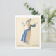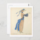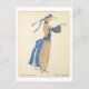Postal de moda francesa vintage con un ilustracion del Gazette Du Bon Ton (1922) No. 3, artísticamente elaborado por el talentoso Soeurs David. Una mujer adornada con un largo vestido marrón con un cordón de cinta adhesiva, complementa el conjunto con un gorra a juego que añade un poco más de encanto al conjunto. El gorra está adornado con una bonita cinta azul atada y un arco,