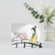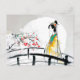 delicada representación en tinta de una geisha sobre un puente, colocada sobre un fondo sereno de agua y árboles.