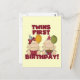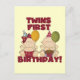 Camisetas gemelas de primer cumpleaños, trajes para el cuerpo, imanes, tarjetas, posters, keepsakes y más con un bebé y un gemelo chica en gorras y globos fiestas y texto que dice "¡Gemelos primer cumpleaños!".