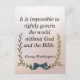 Esta postal tiene una cita de George Washington. "Es imposible gobernar correctamente el mundo sin Dios y la Biblia" El fondo es un gradiente de luz con un aspecto nítido. Hay una corona de laurel con un arco azul en la parte inferior y continuando por los lados.