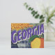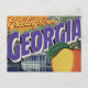 This charming, retro-style design features the classic "Greetings from Georgia" typography set against symbolic landmarks of the Peach State. The foreground highlights a large, vibrant peach, while the background captures a quintessential Southern scene: a beautiful antebellum-style mansion nestled in a watery landscape with Spanish moss hanging from the trees. Perfect for fans of vintage travel posters, retro artwork, Southern history, and the state's unique charm. This makes an excellent souvenir or gift for locals and visitors.