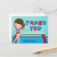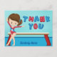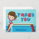 Esta linda tarjeta de agradecimiento para fiesta de cumpleaños de gimnasia de niñas presenta a una linda niña gimnasta morena parada frente a una viga. Lleva un leotardo rojo y sonríe junto a su hermoso monograma azul.