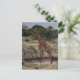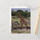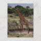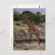Escena clásica africana de jirafa y cebra rodeando un agujero de agua poco profundo en Masai Mara, Kenia. Postal de personalizable completo.