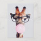 Girafa con gafas soplando un chicle rosado.
