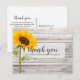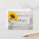 Esta tarjeta de agradecimiento de fiesta de cumpleaños presenta una textura de madera con un solo girasol y se utilizan tipografías de letra cursiva y modernas. La parte trasera de la tarjeta se puede personalizar o se puede eliminar el texto para un mensaje escrito a mano.
