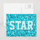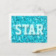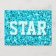 Postcard con un diseño moderno con estrellas diseminadas sobre un estilizado fondo de patrón "secuin look" y "STAR" en tonos azules. Se puede usar como fondo para tu propio texto, imágenes e ideas. Tenga en cuenta que se trata de una imagen de arte digital impresa, que no brilla ni contiene purpurinas o secuencias reales.