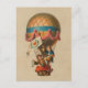Imagen vintage de mediados a finales del siglo XIX de dos niños ascendiendo en un globo aerostático con una bandera cardíaca.