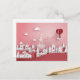 Pareja cortada en un aire caliente sobre París con casas, árboles y la Torre Eiffel.