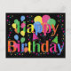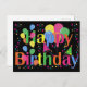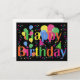 Tarjetas postales en blanco felices cumpleaños coloridas. Globos en diferentes colores vibrantes con estrellas, confeti y sombreros de fiesta. Fondo negro. Personalice agregando su nota manuscrita.