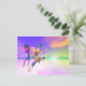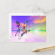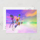 Postal con mi arte digital de globos de colores brillantes flotando en un cielo rosa, naranja, azul, verde y amarillo.