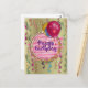 Celebre el día especial de su ser querido con esta festiva tarjeta postal de cumpleaños. El fondo metálico dorado está adornado con serpentinas coloridas, creando una atmósfera alegre. El centro de la tarjeta es un círculo con marco metálico dorado y pinceladas rosadas con "Feliz Cumpleaños" escrito en elegante letra cursiva púrpura. Tres globos en rosa, púrpura y azul flotan en la esquina superior derecha, lo que añade al ambiente de celebración. Personalice esta tarjeta postal para hacerla la sorpresa perfecta de cumpleaños.