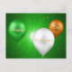 Un ilustracion del Día de San Patricio: 3 globos en el color verde de la bandera irlandesa, blanco, naranja con el texto "Feliz Día de San Patricio" en letras doradas sobre un fondo verde con brillantes estrellas.