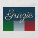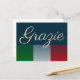 Esta tarjeta postal personalizada presenta un tema italiano elegante. "Grazie" está impreso en la parte superior en una hermosa fuente de escritura dorada. Grazie significa "Gracias" en Italia. El fondo es de un rico color azul marino con una imagen de una bandera italiana desvanecida en la parte inferior. Un mensaje de ejemplo está impreso en la parte posterior, seguido de un apellido. Puedes personalizar la tarjeta postal para incluir tu propio mensaje personalizado u otro texto.