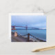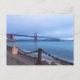 A photograph captures the iconic Golden Gate Bridge in San Francisco, shrouded in a thick layer of fog. The bridge's red structure stands out against the soft blue sky and the misty water below. The foreground features a chain-link fence and a concrete post, leading the viewer's eye towards the majestic bridge.