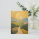This serene landscape painting depicts a winding path leading through a lush, verdant valley toward distant, rolling mountains. The most striking element is a magnificent, radiant sun that dominates the upper half of the canvas, rendered in circular, sweeping brushstrokes of shimmering gold and soft ochre. The foreground is filled with dense, dark green evergreen forests and gentle hills in shades of mustard yellow, moss green, and a singular pop of dusty rose. The overall atmosphere is one of tranquil exploration, combining a folk-art sensibility with a rich, metallic texture that makes the sky appear to glow with eternal light.