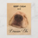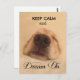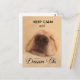 Esta postal muestra una fotografía de un perro recuperador dorado durmiendo en un armario. La foto tiene un enfoque suave, una calidad de sueño, junto con el texto "Mantén la calma y sueña con".