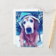 Esta postal presenta un retrato de arte azul vibrante de un perro recuperador de oro que está usando un lindo gorra de invierno, y parado en la nieve. El texto de la parte trasera del personalizable dice: "Deseos cálidos de invierno".