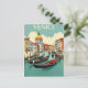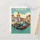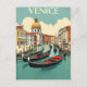 Esta imagen es un afiche de viajes vintage para Venecia. Se trata de un pintoresco canal con varias góndolas flotando en el agua. La arquitectura se compone de edificios coloridos y de una destacada estructura de cúpula en el fondo. El cielo está despejado con algunas nubes, y la palabra "VENECIA" aparece de forma destacada en la parte superior.