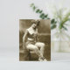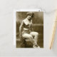 Fotografía vintage de una joven en lo que podría ser un traje de baño de gran color blanco y cinturón. Ella tiene una bufanda atada de manera extraña en su cabeza. Tiene tacones altos, medias rodadas y lazos oscuros guardados de sus zapatos. Sus piernas están cruzadas con las rodillas afuera