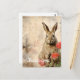 Un conejo marrón se representa frente a un fondo abstracto, mirando directamente al espectador con una mirada atenta. En primer plano, el conejo está acompañado por un tallo de rosas rosadas vibrantes, contrastando con los tonos suaves del fondo.
