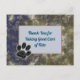 ¿Tiene a alguien que cuide a sus mascotas cuando está de vacaciones o alguien que pasee a su perro diariamente? Esta tarjeta postal de agradecimiento presenta un patrón abstracto azul y dorado arremolinado que es elegante y se asemeja a un patrón de mármol. Un rectángulo azul claro y dorado sólido está centrado en la parte frontal de esta tarjeta postal y proporciona el fondo para sus palabras de agradecimiento. Una huella de pata negra aparece en la esquina inferior del rectángulo sólido central. "Gracias por cuidar bien a Fido" se puede personalizar fácilmente con el nombre de su mascota.