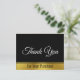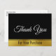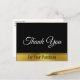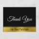 En el frente, un elegante guión en blanco dice "Gracias" en el centro de la postal. En la parte inferior, hay un texto en negro que puede editar (Mostrar: Para su compra). El texto negro está en una franja dorada. En la parte posterior, se muestra el texto de la dirección de devolución y las líneas de la dirección del destinatario. Todo el texto se puede editar o eliminar. El oro falso es una representación artística (es decir, no es Relieve metalizado). Esta postal no tiene mínimos.