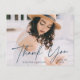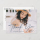 Moderna graduación fotográfica gracias a la postal que presenta la foto del graduado con "gracias" en un sobrepuesto manuscrito de caligrafía marina. Personalice la parte delantera de la graduación gracias postal añadiendo el nombre del graduado y el año de graduación. La tarjeta postal de agradecimiento de la foto se invierte para mostrar su dirección de retorno y mensaje de personalizado.