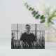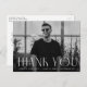 Simple graduación gracias a la postal con la foto horizontal del graduado con "Gracias" mostrada en letras blancas y modernas de Art Deco. Personalice la parte delantera de la foto graduada gracias a la tarjeta postal agregando el nombre del graduado, el nombre de la escuela y el año de graduación. La tarjeta postal se invierte para mostrar la dirección de retorno y proporciona espacio para el mensaje de agradecimiento escrito a mano o escrito a máquina.