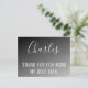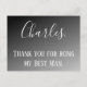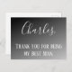 Muéstrale a tu mejor hombre lo mucho que le apreciaste en tu gran día con esta tarjeta de agradecimiento "Gracias por ser mi mejor hombre" boda. Esta tarjeta postal de agradecimiento personalizada presenta un diseño de gradiente negro con su nombre escrito en un gran tipo de letra cursiva blanca. Debajo del nombre está "Gracias por ser mi mejor hombre" escrito en blanco estándar impreso. Personaliza tu postal de agradecimiento hoy!
