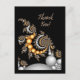 Elegante diseño para saludos de Gracias. Cuentas plateadas, doradas y blancas con una espiral de detalles intrincada sobre un fondo negro. Las letras de plata y oro biseladas deletrean "Gracias".