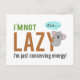 La graciosa leyenda dice "No soy perezoso" y "solamente estoy conservando energía". Un adorable oso dormido koala está abrazando el alfabeto Y y durmiendo. El oso koala puede parecer perezoso porque no hace mucho y duerme la mayor parte del tiempo, pero la razón es que la comida que come le da muy poca energía y necesita conservar energía.