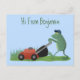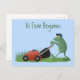 Una extraña rana verde cortando el césped al estilo personalizado.