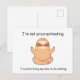 El diseño de esta tarjeta presenta un delicioso y divertido ilustracion kawaii de una mancha perezosa sentada en una pose de yoga con una expresión de contenido en la cara. El mensaje humorístico "No estoy retrasando, estoy priorizando mi tiempo para no hacer nada" está escrito en tipografía audaz y juguetona que complementa la estética kawaii del ilustracion. El texto pretende transmitir un sentido de autoconciencia y humor sobre las alegrías de tomarse un descanso y darse el gusto en algún momento de relajación tan necesario.