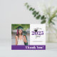Esta tarjeta de agradecimiento de graduación con foto ofrece un marco de foto personalizado y acentuado con un estilo de bloque de color púrpura y blanco. La promoción de 2025 aparece con un gorro de graduación encima del "0".