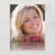 Envíe una elegante postal de agradecimiento a su familia y amigos por sus regalos de graduación. Este diseño muestra su foto en el frente con un guión moderno que lee. "Amor y agradecimiento" en tipografía negra con tu nombre, colegio y clase/año a continuación. La parte posterior de la tarjeta tiene un ilustracion de un título de graduación y desplácese con un mensaje que puede personalizar. Diseñado por la artista ©Susan Coffey. Fotografía © Storytree Studios, Stanford, CA.