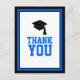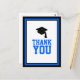 Escribe tu agradecimiento con esta fiesta de graduación azul y negro Gracias Postcard. Incluye "Gracias" en azul y una tapa de grad negra rodeada por un borde negro y azul. La parte posterior está en blanco para su mensaje personal.