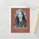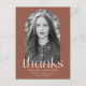 Moderna graduación gracias a la postal con la foto del graduado enmarcada por un marco marrón en forma de arco. "Gracias" se exhibe con letras en cursiva beige moderno. Personalice la parte delantera de la graduación de moda gracias a la tarjeta postal añadiendo el nombre del graduado, el nombre de la escuela y el año de graduación. La tarjeta postal se invierte para mostrar la dirección de retorno y el mensaje de personalizado.