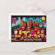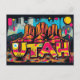 ¡Postal del estado Utah, EEUU! Esta postal en estilo graffiti presenta un gran guión de UTAH en rosa amarillo, frente al abstracto Valle del Monumento y las montañas Wasatch. Todas las frases de texto se pueden personalizar para que se adapten a su gusto.