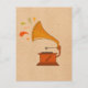 ilustracion de un gramófono de música vintage con estallidos musicales saliendo de él, diseño groovy estilo años 70, sobre fondo de speckeld marrón