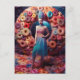 IA generó arte de una hermosa modelo de moda femenina frente a una obra de rosquilla gigante con más donuts en el suelo