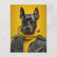 Hermoso Gran Danés en una chaqueta de cuero negro con un cobo amarillo.