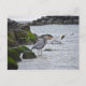 Postal "Great Blue Heron and Brown Pelican" de Catherine Sherman. Una gran garza azul se alza cerca de las rocas de las mezquitas cerca de Pelican Point, en la isla de Dauphin, Alabama. Al fondo, un pelícano marrón se traga un pez. Más allá del pelícano hay un cormorán de doble cresta. Isla Dauphin es una isla de barrera situada en la desembocadura de Mobile Bay en el Golfo de México.