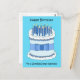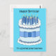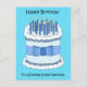 Una torta gigante de cumpleaños, helada en azul y blanco, cubierta con varias velas encendidas. La imagen tiene un fondo turquesa y va acompañada de las palabras 'Feliz cumpleaños a un gran sobrino especial'.