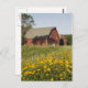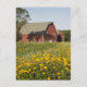 Postal Granero rojo con flores silvestres amarillas