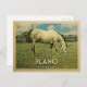 Postal de viaje rural Vintage de Plano Texas. Cuenta con un caballo blanco pastoreando sobre hierba verde con vallas y nubes azules sobre el cielo. Una divertida imagen de granja rural con encanto rústico.