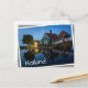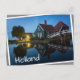 Foto postal de una casa tradicional de madera usada como una granja de quesos con pintura verde con tejas rojas y reflejo en el agua al inicio de la noche al crepúsculo en el museo Zaanse Schans en Holanda con un borde blanco y el texto 'Holanda'. La imagen está un poco rotada, para crear el efecto de tenerla suelta.