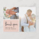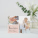 Una postal moderna de agradecimiento diseñada para alojar dos de tus fotos favoritas de bodas. "Gracias" aparece en la parte inferior izquierda con letras manuscritas en un fondo rosa negro, con sus nombres debajo. Las postales se invierten para mostrar su dirección de retorno con amplio espacio para el direccionamiento del destinatario, así como un mensaje preimpreso opcional. Si prefiere agregar un mensaje manuscrito, simplemente elimine el texto de ejemplo que se muestra.
