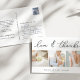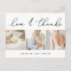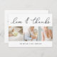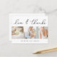 Una postal moderna de agradecimiento diseñada para alojar tres de tus fotos bodas favoritas en un formato cuadrado alineado lado a lado. "Amor y agradecimiento" aparece en la parte superior de la moda con letras manuscritas, con sus nombres debajo. Las postales se invierten para mostrar su dirección de retorno con amplio espacio para el direccionamiento del destinatario, así como un mensaje preimpreso opcional. Si prefiere agregar un mensaje manuscrito, simplemente elimine el texto de ejemplo que se muestra.