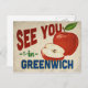 Una encantadora postal de viajes vintage de Greenwich Connecticut que incluye una hermosa manzana roja, junto con un divertido texto de estilo retro que dice: "Nos vemos en Greenwich"