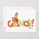 This vibrant and bold graphic is the perfect logo for the holiday mischief-maker! The word "GRINCH!" is displayed in large, stylized letters, primarily in festive red and lime green. The Grinch himself (in his Santa suit) stands right over the letters with his hands on his hips, looking mischievously proud. Beside him, his loyal partner, Max the Dog (complete with reindeer antlers), sits patiently. This fun graphic is a great way to celebrate the iconic characters and their story!